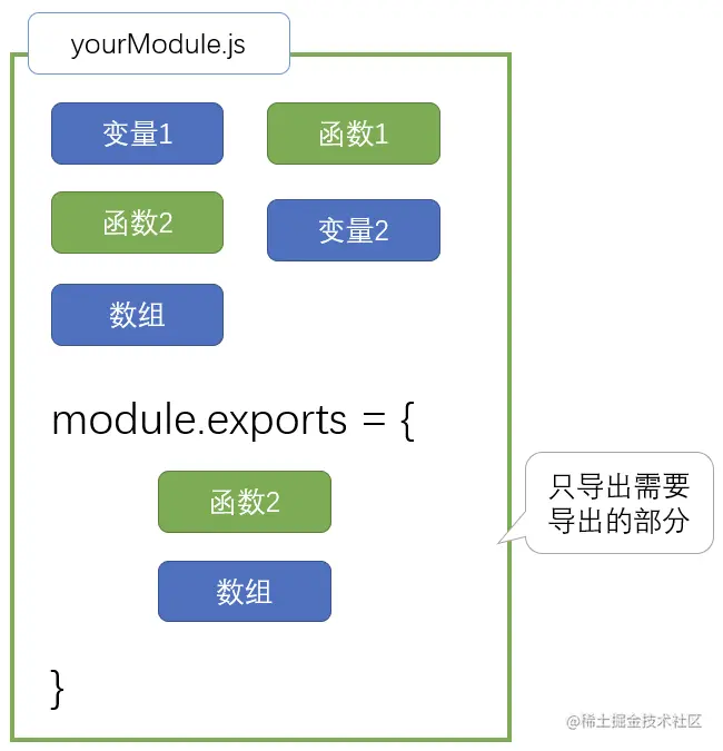 - 不必要导出所有函数,对象,数组等。那些没有导出的部分就相当于这个模块的内部变量了。在下图中变量1,函数1,数组就是模块内部的数据,在外部无法别访问到。