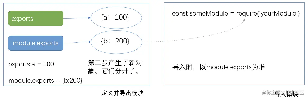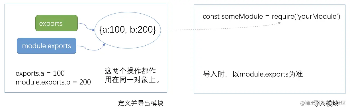 - module.exports 是固定写法,一般放在文件的最末尾,也只用一次。