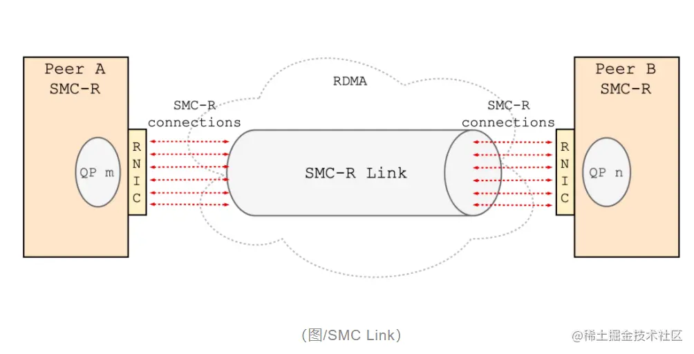通信两端将已创建的 RDMA 资源通过 CLC 消息同步到对端,进而在两端之间建立起基于 RC (Reliable Connection) QP 的 RDMA 链路。SMC-R 中将这种点对点逻辑上的 RDMA 链路称为 SMC-R Link。一条 SMC-R Link 承载着多条 SMC-R 连接的数据流量。