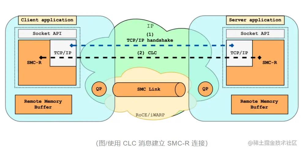 若在 TCP 握手中,两端均表示支持 SMC-R,则进入 SMC-R 建连流程。SMC-R 连接的建立依赖 TCP 连接传递控制消息,这种控制消息被称为 Connection Layer Control (CLC) 消息。