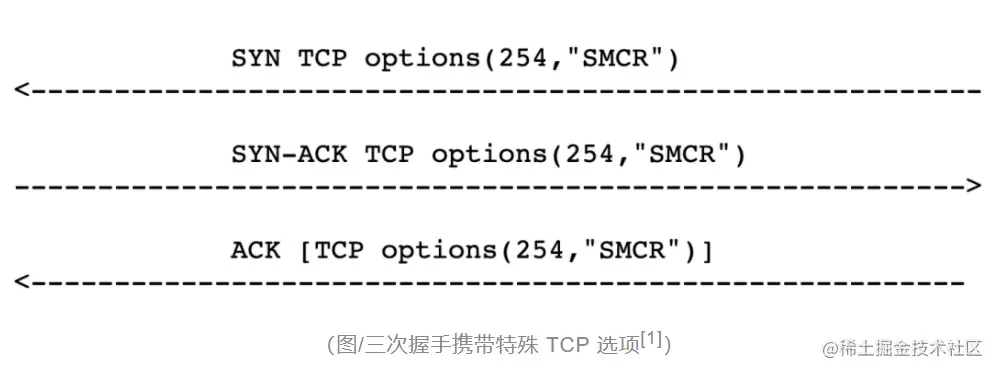 在 TCP 连接三次握手中,使用 SMC-R 协议的一端发送的 SYN/ACK 中携带了特殊的 TCP 选项 (Kind = 254,Magic Number = 0xe2d4),用于表明自身支持 SMC-R。通过检查对端发送的 SYN/ACK,通信节点得知其 SMC-R 能力,进而决定是否继续使用 SMC-R 通信。