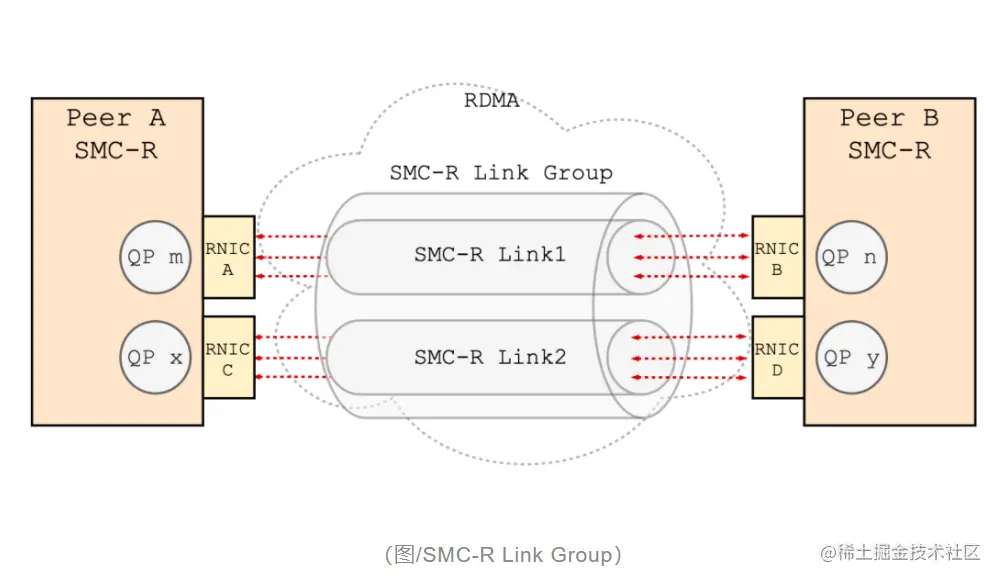 若通信节点之间存在不止一对可用的 RNIC,则会建立不止一条 Link。这些 Link 在逻辑上组成一个小组,称为 SMC-R Link Group。