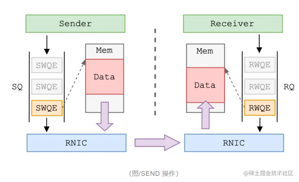 SEND 操作又被称为“双边操作”,这是因为 SEND 操作要通信两端都参与进来。一次 SEND 的传输过程为: