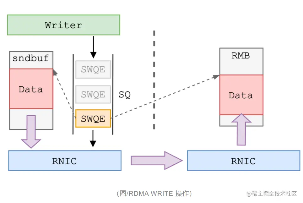 - 协议栈通过 RDMA WRITE 单边操作将数据写入接收端 RMB 中