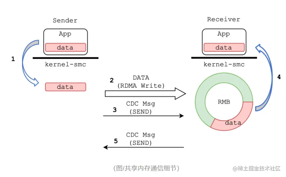 在系列文章的第一篇中我们提到,SMC-R 名称中的“共享内存”指的是接收端的 RMB。结合上述的 RDMA WRITE 操作与 CDC 消息,SMC-R 的共享内存通信流程可以总结为: