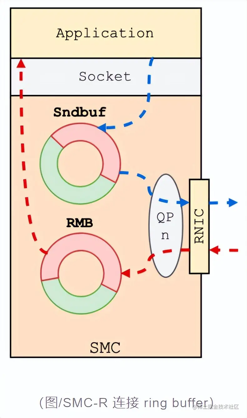 其中,sndbuf 用于存放连接待发送的数据,被注册为 DMA 内存。本地 RNIC 设备可以直接访问 sndbuf,从中取走有效负载 (payload)。而 RMB 用于存放远程节点 RNIC 写入的数据,即连接待接收的数据。由于需要被远程节点访问,因此 RMB 被注册为 RDMA 内存。