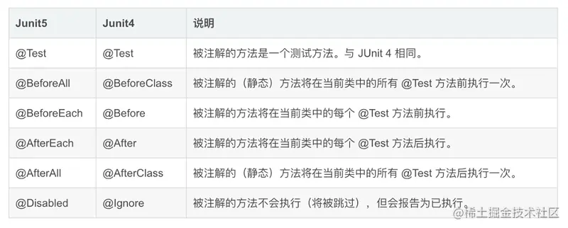 JUnit 4 与 JUnit 5 中的注解比较\ -
