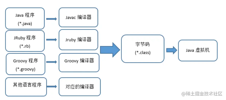 - 过程如下:Java 文件->编译器>字节码->JVM->机器码。\