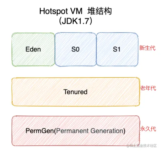 JDK7及之前:新生代内存,老生代,永久代\