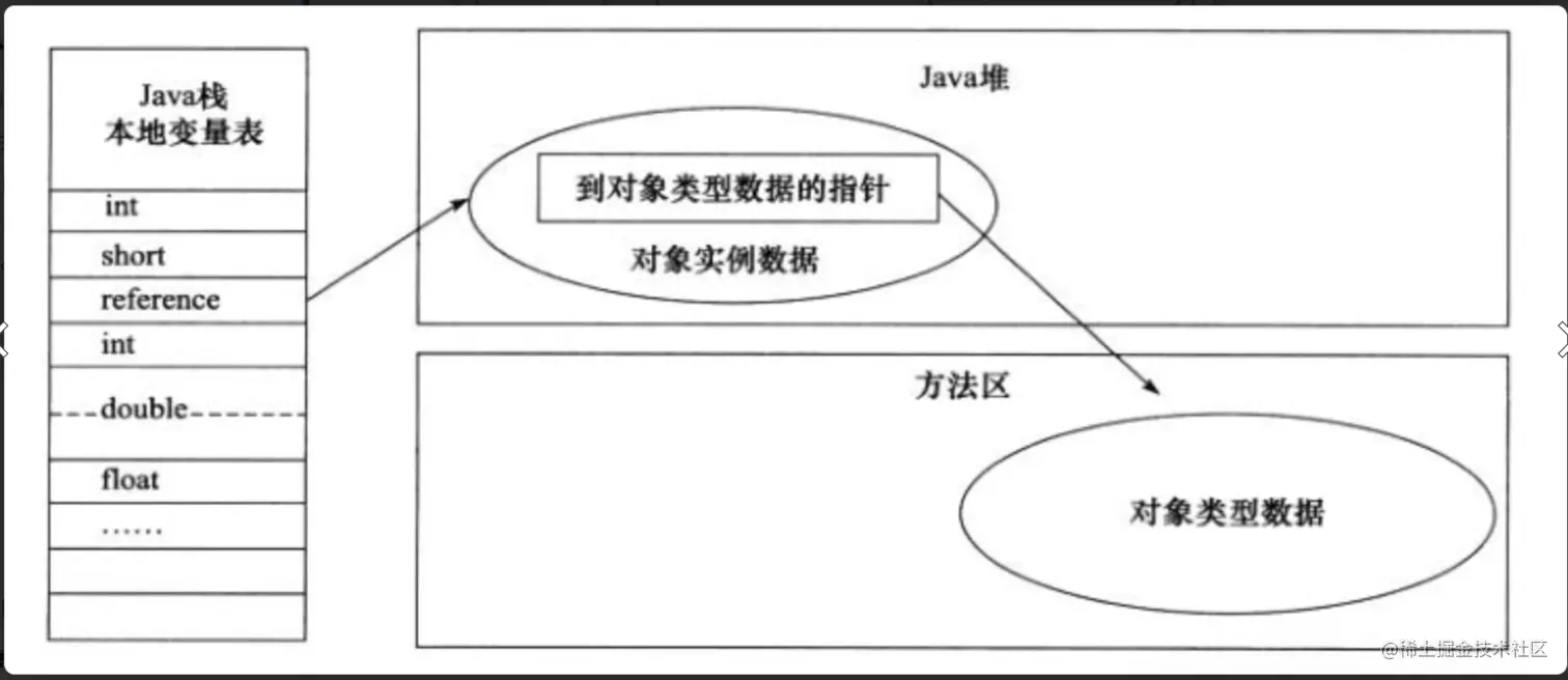 - 主要存放了编译期可知的各种数据类型(boolean、byte、char、short、int、float、long、double)、对象引用(reference 类型,它不同于对象本身,可能是一个指向对象起始地址的引用指针,也可能是指向一个代表对象的句柄或其他与此对象相关的位置),returnAddress类型(指向了一条字节码指令的地址)。\