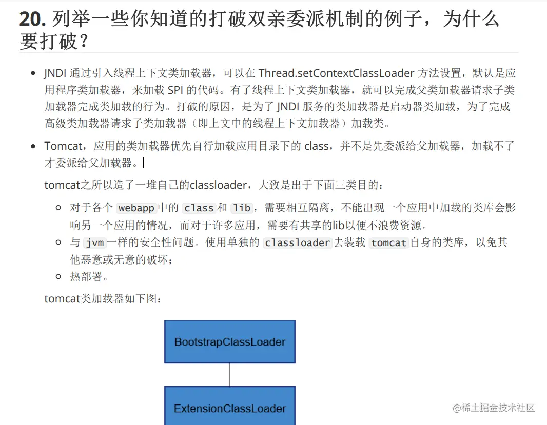 - 自定义类加载器的话,则需要继承 ClassLoader 。如果我们不想打破双亲委派模型,就重写 ClassLoader 类中的 findClass() 方法即可,无法被父类加载器加载的类最终会通过这个方法被加载。但是,如果想打破双亲委派模型则需要重写 loadClass() 方法。( loadClass()中实现了双亲委派)\