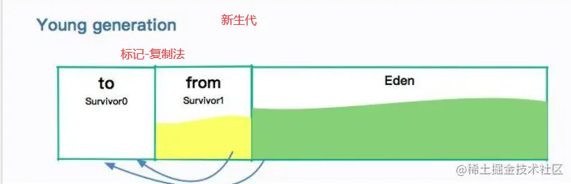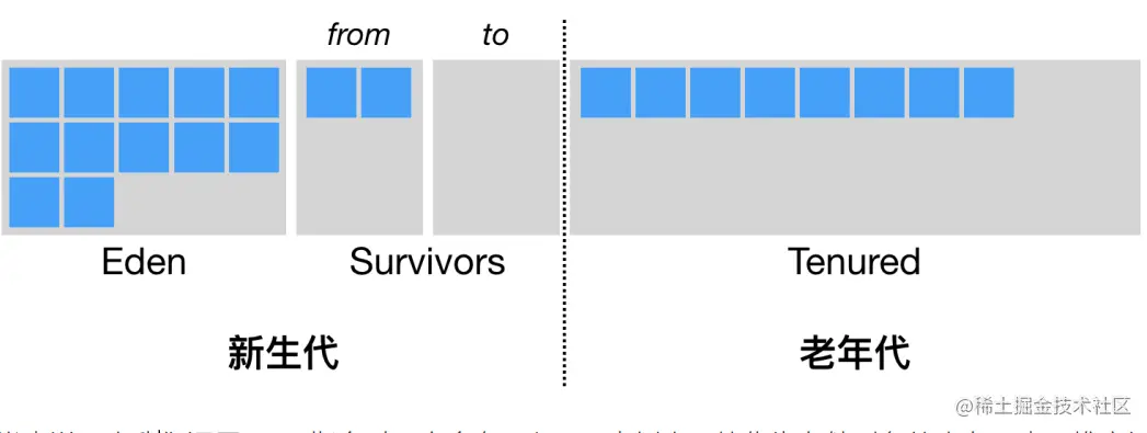 Java 堆还可以细分为:新生代和老年代;再细致一点有:Eden、Survivor、Old 等空间。进一步划分的目的是更好地回收内存,或者更快地分配内存。Java 虚拟机将堆划分为新生代和老年代。其中,新生代又被划分为 Eden 区,以及两个大小相同的 Survivor 区。\