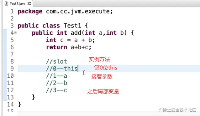 对于实例方法,第0位slot存放的是this,然后从1到n ,依次分配给参数列表\