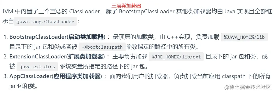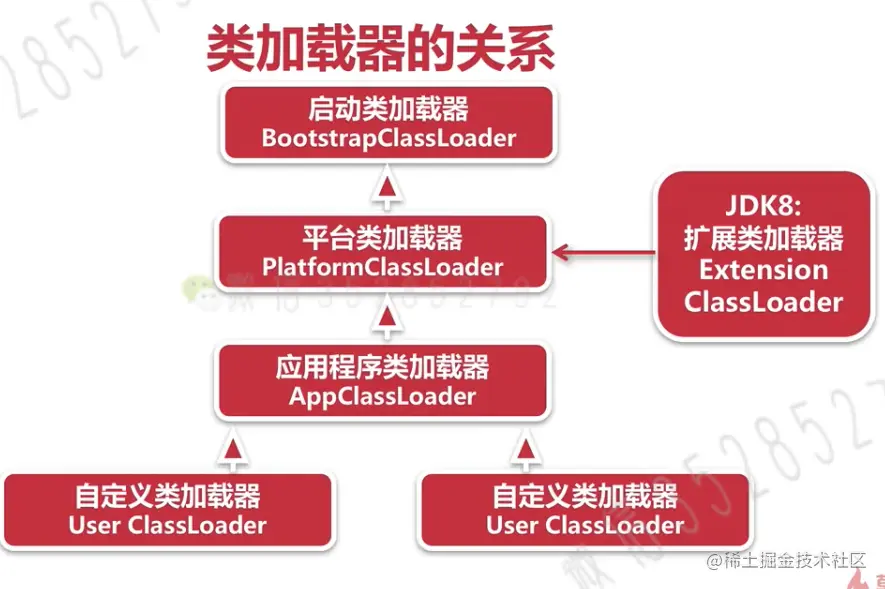 - 所有其它类的加载器,使用 Java 实现,独立于虚拟机,继承自抽象类 java.lang.ClassLoader。\