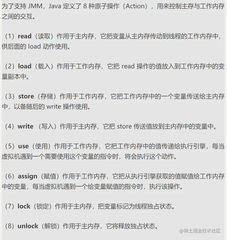 JMM中支持主内存和工作内存的八种原子操作\