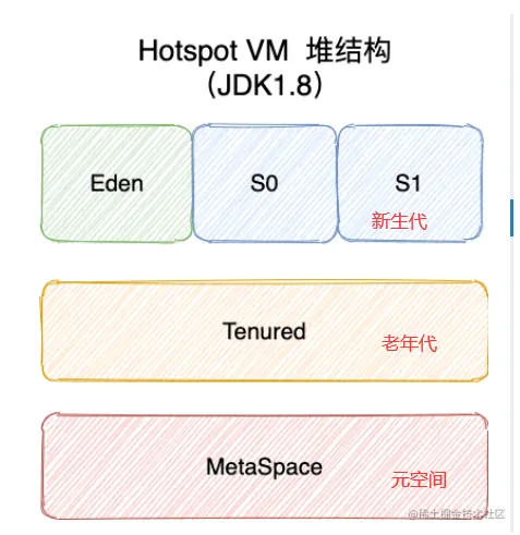 JDK8:新生代内存,老生代,元空间\