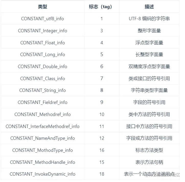 - Class 文件中除了有类的版本、字段、方法、接口等描述信息外,还有用于存放编译期生成的各种字面量和符号引用的常量池表。常量池表会在类加载后存放到方法区的运行时常量池中。\