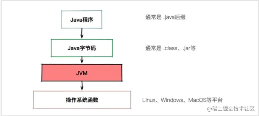 - JVM 即 Java 虚拟机。它能识别 .class后缀的文件,并且能够解析它的指令,最终调用操作系统上的函数,完成我们想要的操作。