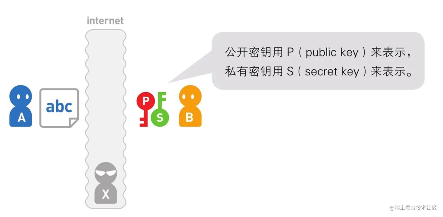 假设A准备通过互联网向B发送数据。首先,需要由接收方B来生成公开密钥和私有密钥。然后把公开密钥发送给A。A使用B发来的公开密钥加密数据。A将密文发送给B, B再使用私有密钥对密文进行解密。这样,B就得到了原本的数据。