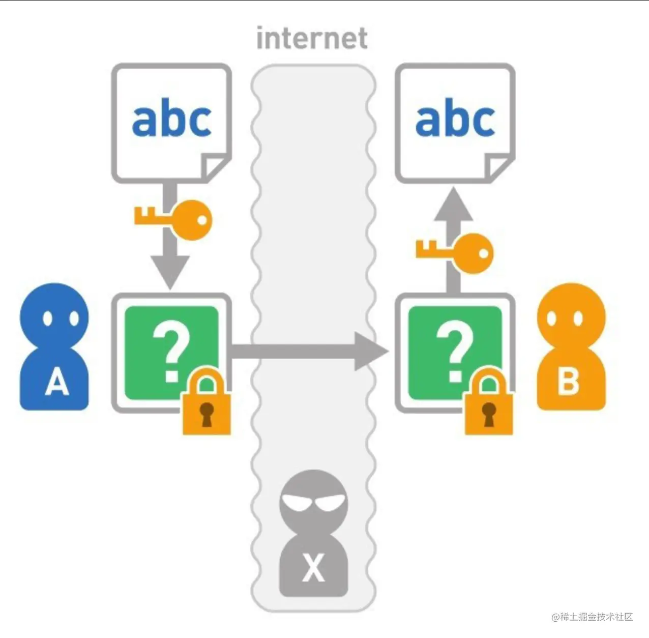问题:A和B无法直接沟通,B并不知道A加密时使用的是什么密钥。所以A需要将用某种方式将密钥发送给B,过程中密钥可能被X窃听。