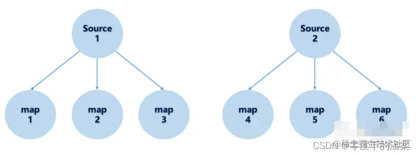 (1)One to One模式:两个operator用此模式传递的时候,会保持数据的分区数和数据的排序;如上图中的Source1到Map1,它就保留的Source的分区特性,以及分区元素处理的有序性。