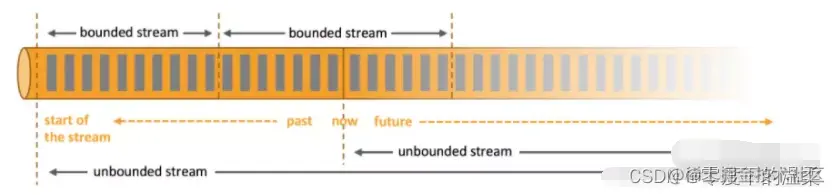 无界数据,就是持续产生的数据流,数据是无限的,有开始,无结束,一般 流处理 用来处理无界数据。如图 unbounded stream。