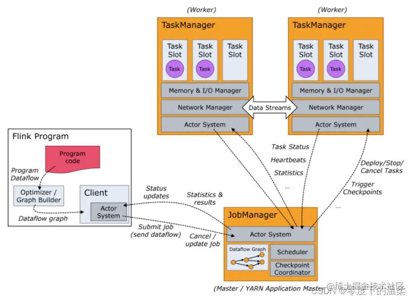 Flink 集群采取 Master-Slave 架构,Master的角色为 JobManager,负责集群和作业管理,Slave的角色是 TaskManager,负责执行计算任务,同时,Flink 提供客户端 Client 来管理集群和提交任务,JobManager 和 TaskManager 是集群的进程。