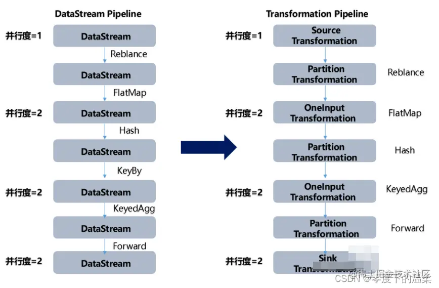 DataStream是逻辑概念,为开发者提供API接口,Transformation是处理行为的抽象,包含了数据的读取、计算、写出。所以Flink 作业中的DataStream API 调用,实际上构建了多个由 Transformation组成的数据处理流水线(Pipeline)