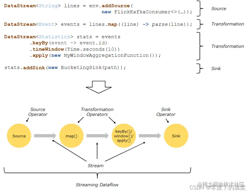 Flink作业中,包含两个基本的块:数据流(DataStream)和 转换(Transformation)。