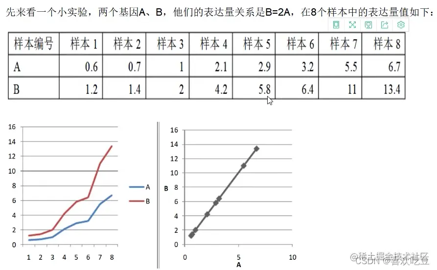 计算得出,他们的皮尔森相关系数r=1,P-vlaue=0, 从以上可以直观看出,如果两个基因的表达量呈线性关系,则具有显著的皮尔森相关性。