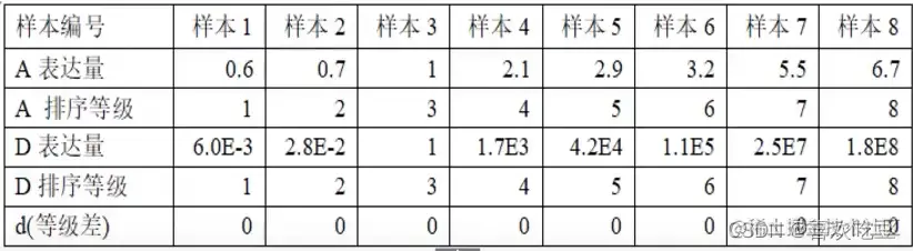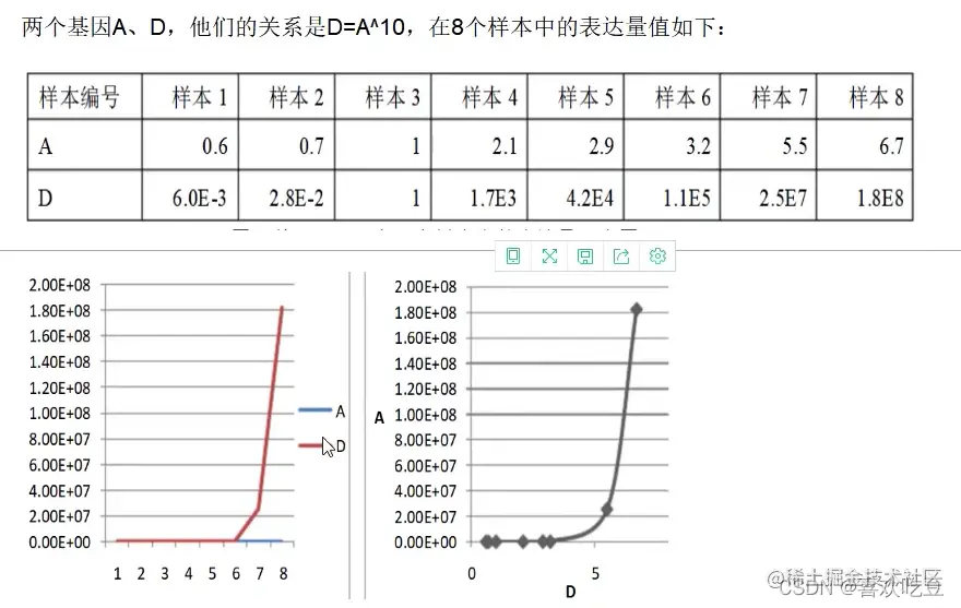 两个基因A、D,他们的关系是D=A^10,在8个样本中的表达量值如下:
