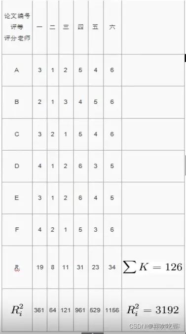 某校开展学生小论文比赛,请6位教师对入选的6篇论文评定得奖等级,结果如下表所示,试计算6 位教师评定结果的kandall和谐系数。
