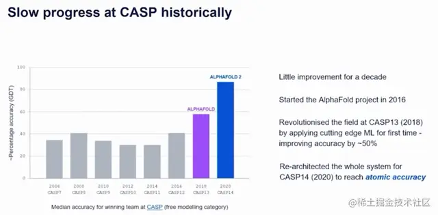 2018年,DeepMind带着AlphaFold参加了第13届CASP竞赛,首次把尖端机器学习技术运用到了结构预测领域,一举夺冠,而且预测准确率比往年冠军队伍高出近50%。
