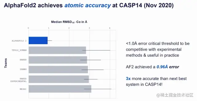 CASP的主办方告诉我们,这可以和实验室方法媲美,更重要的是,我们的技术可以供科研人员所用。 我们的误差的准确数据是0.96埃米,仅仅是亚军队伍的误差的1/3,而亚军队伍至今沿用的仍是AlphaFold 1技术。其他队伍使用的几乎都是机器学习技术,但AlphaFold 2的预测误差依然最小,而且比其他的小得多。