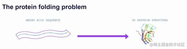 除了游戏,我们后来发现,蛋白质折叠问题也符合我们用AI解决方案的判断标准。所谓蛋白质折叠,就是一维的氨基酸序列折叠成3D的蛋白质结构。