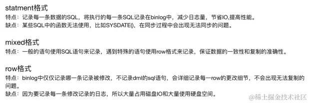 Statement格式: 记录执行的语句,日志小,性能好,但是一些函数的使用可能不一致,主键自增不一致等问题,如获取当前时间插入记录的语句,准确性最低