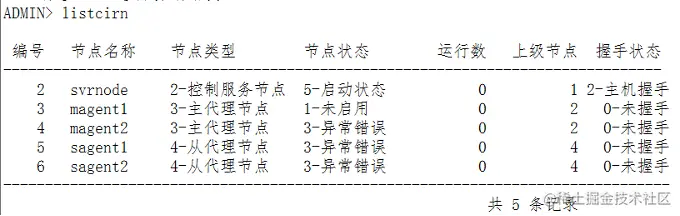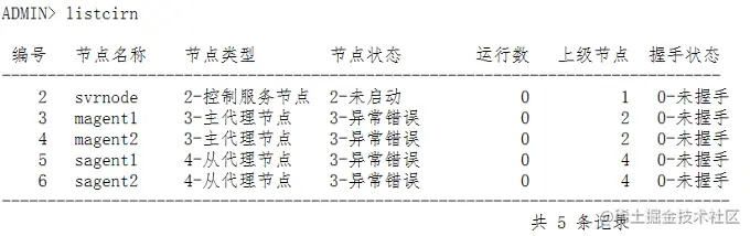 在ctladmin管理平台应用系统下,使用listcirn查看整个平台的CIR节点信息列表对应的CTL节点是否为“5-启动状态”标志,如下图所示: