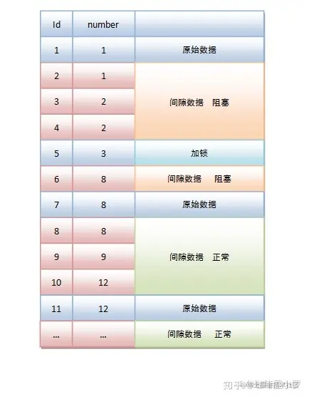 事务3添加 id = 6,number = 8 的数据,给阻塞了; 事务4添加 id = 8,number = 8 的数据,正常执行了。 id = 11,number = 12 的数据修改为 id = 11, number = 5的操作,给阻塞了;