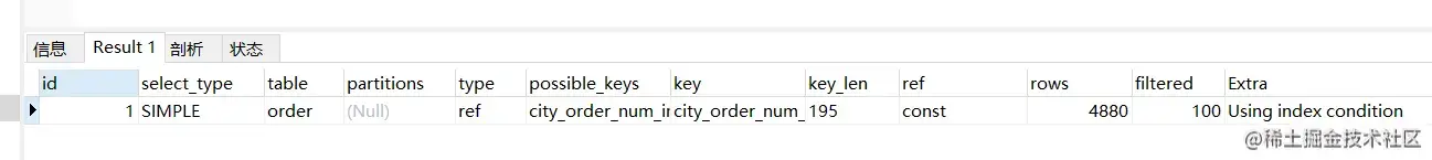 - 进行rowid排序 本文示例中 city,order_num,user_code 长度 = 16+4+16 =36 < 1024, 所以走的是全字段排序。我们来改下这个参数,改小一点,