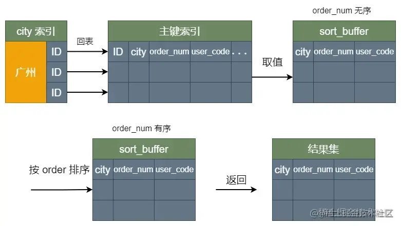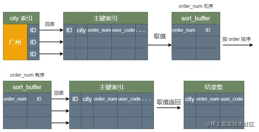 - 到主键 id 索引取出整行,取 city、order_num、user_code 三个字段的值,存入 sort_buffer 中;