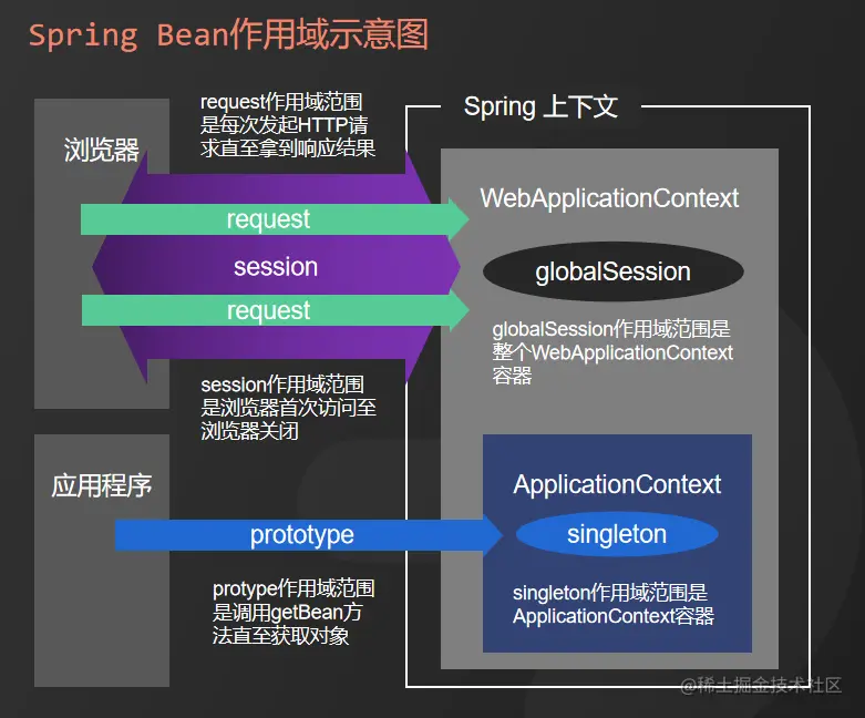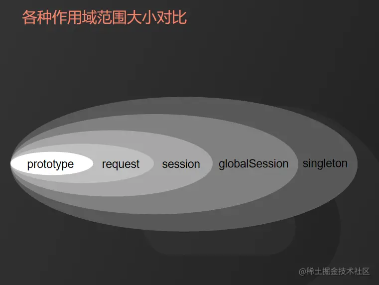 这一张图呢,是表示各种作用域范围大小对比,其中prototype大于request大于session大于globalSession大于singleton。大家可以私信我获取高清图,下载下来慢慢看,帮助大家更好地理解作用域范围。