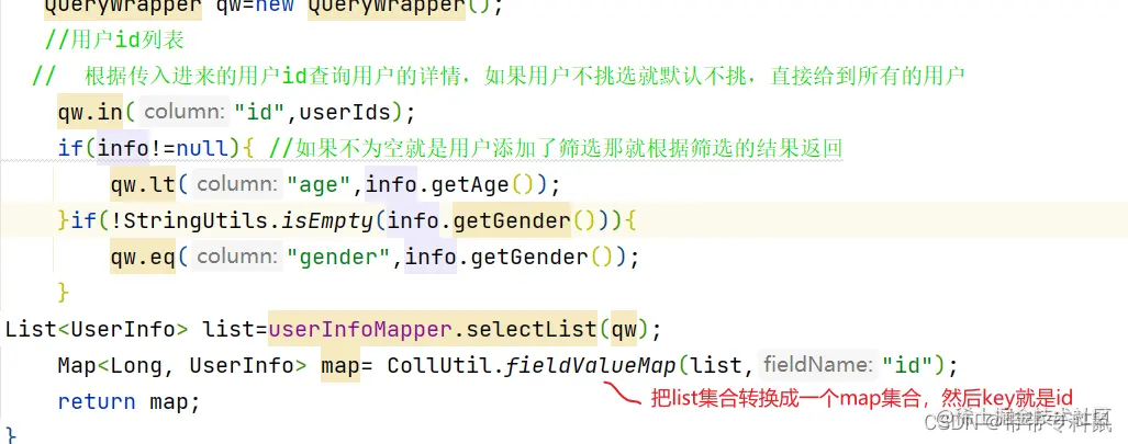 2.如果不是就需要根据用户id获取到用户的资料进行重构一个返回值对象返回出去 CollUtil.getFieldValues(items,"userId",Long.class);根据list中的属性字段单独生成一个list集合