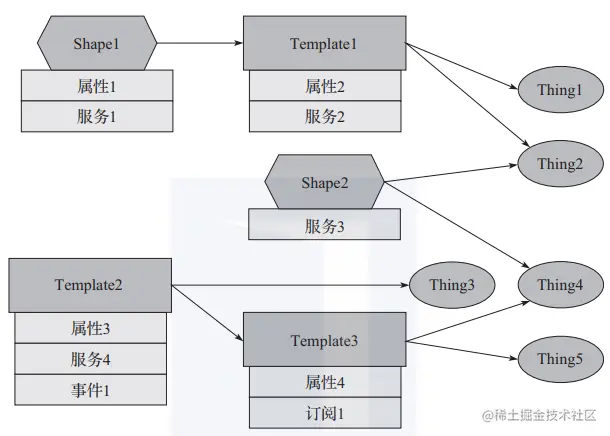 Thing Shape和Thing Template是Thing的类,是在Thing之上更高层面的模块化。Thing可以继承Thing Shape和Thing Template的各种属性和方法。一个Thing需要分配一个Thing Template,也可同时分配一个或多个Thing Shape。