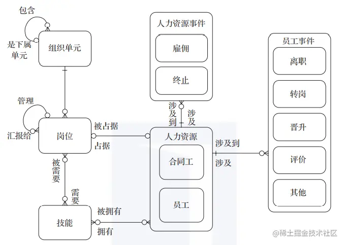 如图1所示,其中的业务对象有合同工、员工、组织单元、岗位和技能,事件则有雇佣、终止、离职、转岗、晋升、评价等。对象之间还有“被拥有”与“拥有”“管理”“汇报给”等关系类型。