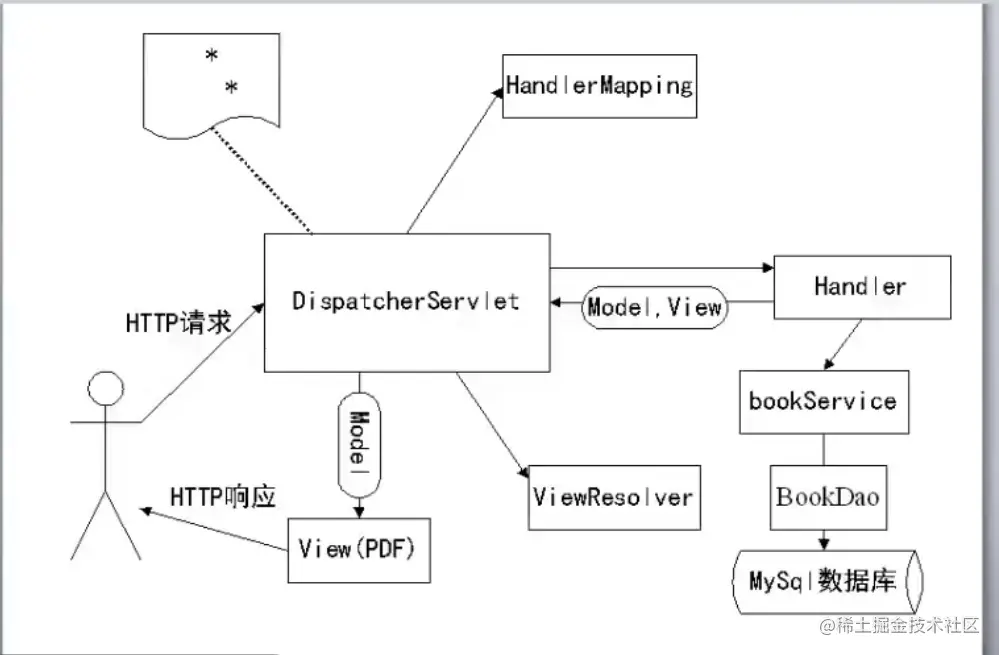 - spring给我们写好了一个类,DispatchServlet,它能截获用户的请求,它就找HandlerMapping(处理映射) 询问那个handler来处理这个请求,Handler处理完之后返回一字符串返回给DisPatchServlet。DispatchServlet找ViewRelover来把这个字符串解析成一个正真的视图文件,相应给客户。