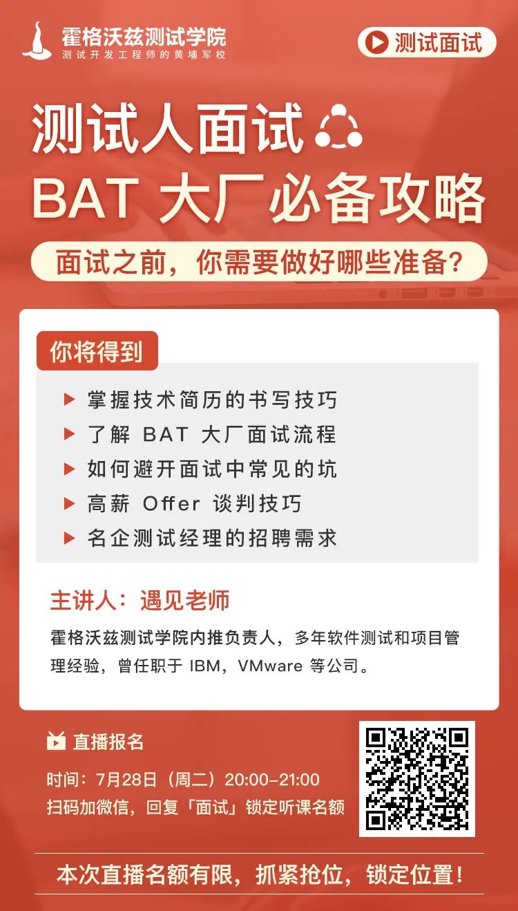 本周二(7月28日)晚8点,霍格沃兹测试学院内推负责人遇见老师将分享《测试人面试 BAT 大厂必备攻略》主题公开课,带你掌握大厂面试技巧,做到有备而战。