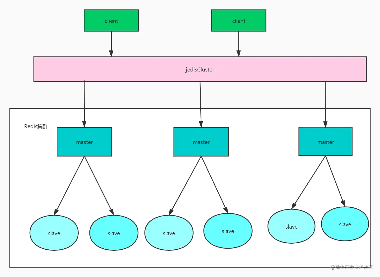 一台master负责写请求 slave只负责读请求 master与slave直接通讯同步数据