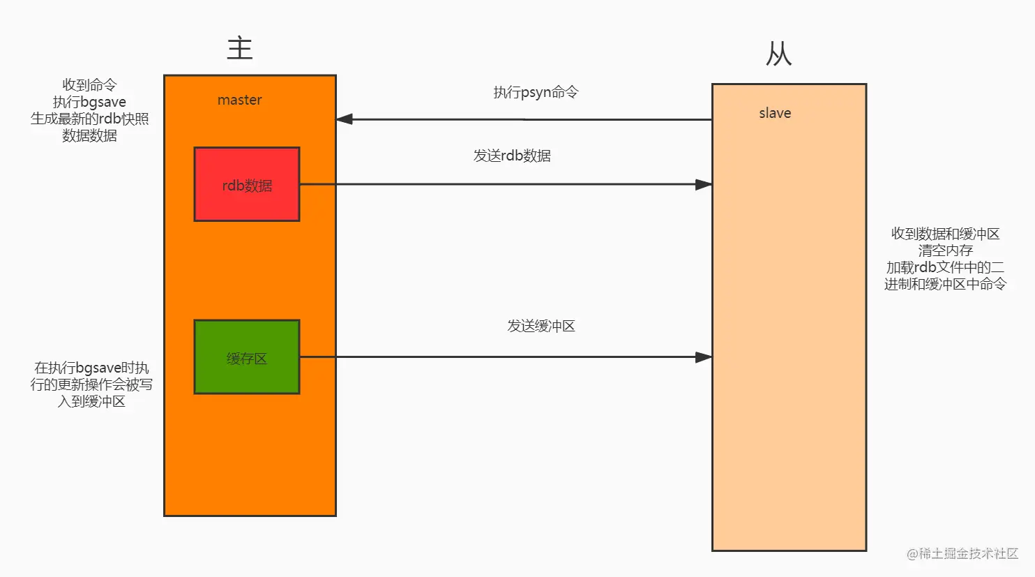 master执行bgsave生成最新数据的rdb快照 在执行bgsave之间的操作会写入缓存区,操作执行完后将rdb快照和缓存区命令发送给slave,slave清空内存加载rdb文件与缓存区命令