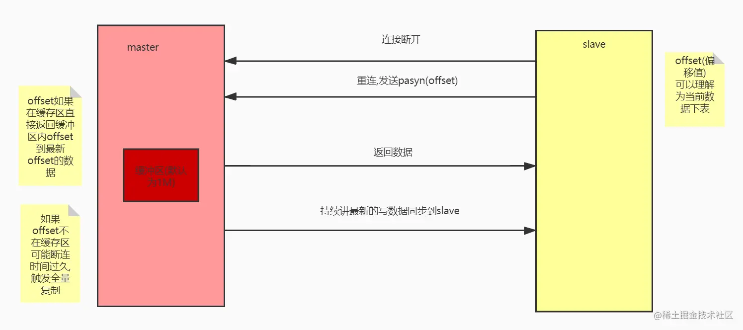 若slave与master直接通讯断开 重连后slave会发送通讯请求并携带当前slave中数据的偏移量(理解为当前slave中数据的最大下标), 如果偏移量在master的数据缓存区内则返回偏移量到最近数据数据若不在触发全量备份