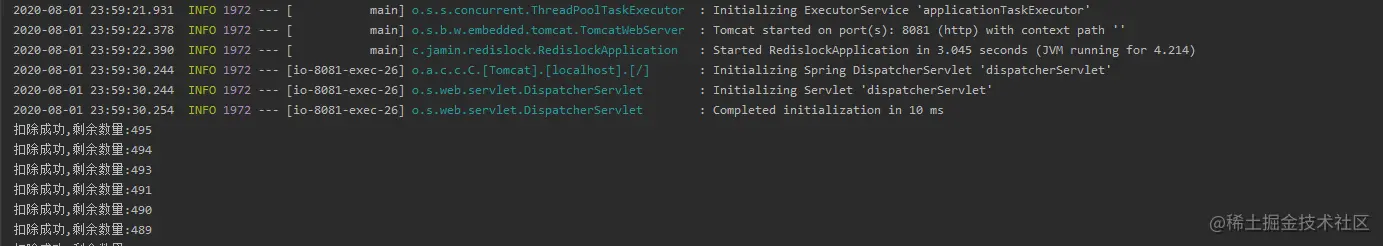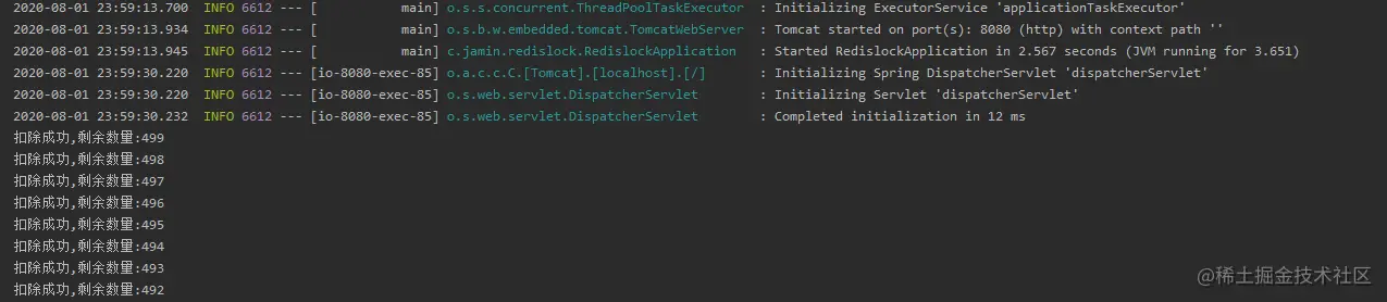 @RequestMapping("redisTest") public synchronized String redisTest() { System.out.println(this); String key = "count"; //获取库存数量 int count = Integer.parseInt(stringRedisTemplate.opsForValue().get(key)); //有库存减少 if (count > 0) { count = count - 1; stringRedisTemplate.opsForValue().set(key, String.valueOf(count)); System.out.println("扣除成功,剩余数量:" + count); } else { System.out.println("扣除失败"); } return "end"; }